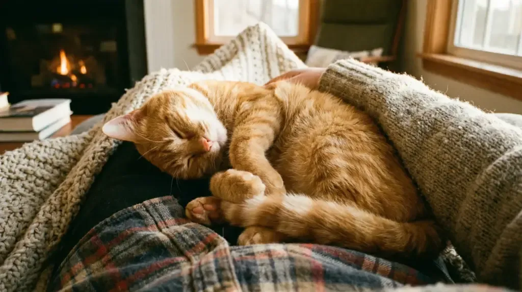 When a cat sits on you, they are using you as a giant, rechargeable heating pad. If they choose your lap specifically, it’s a sign that they feel completely safe letting their guard down to recharge their batteries on you. Similar to The “Dog Hug†where dogs lean on their owners, this is a profound display of security.