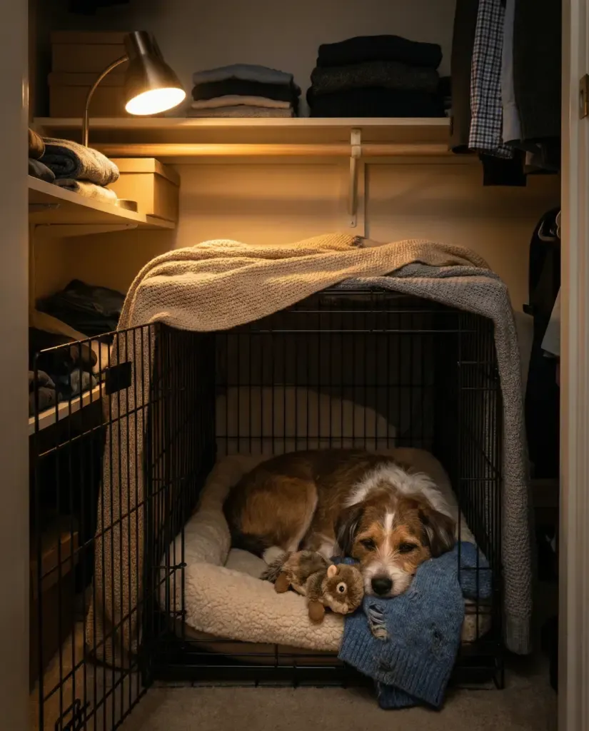 Pick an interior room with no windows if possible. A bathroom works well. A basement. A walk-in closet. Fill it with familiar things - their bed, favorite toys, maybe a shirt you’ve worn recently that smells like you. If your dog is crate-trained and finds their crate comforting, put it in this room and drape blankets over the top and sides to muffle sound and block flashes.
